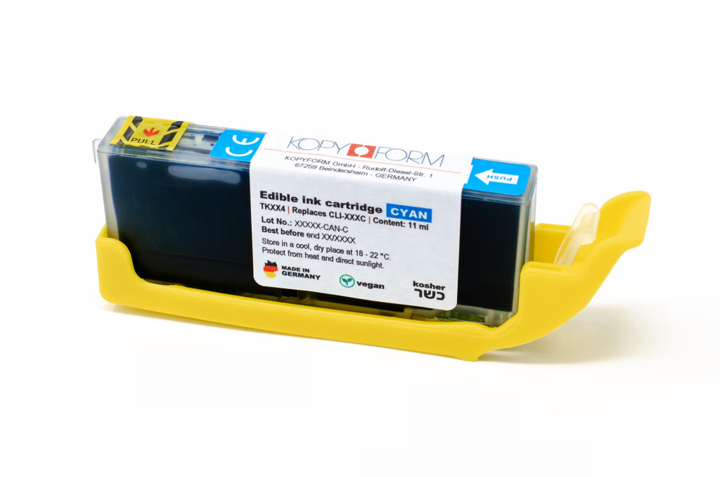 A KOPYFORM kifejezetten Canon nyomtatókhoz kifejlesztett ehető tintája tökéletes a professzionális ehető nyomtatáshoz. A patronok megfelelnek a legmagasabb minőségi és biztonsági előírásoknak. Minden patront Németországban töltenek fel házon belül gyártott tintával, hogy megbízható és következetes eredményeket biztosítsanak.